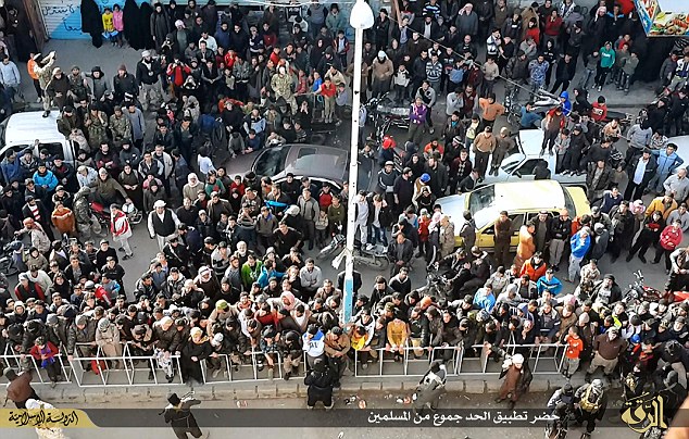 With the baying crowd clambering on to rooftops to get a better view of the savage scene, the blindfolded man is dragged to the roof of the tallest building in the neighbourhood by bearded militants, who use mobile phones to film him being barbarically thrown to his death.