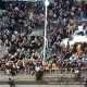The photographs shows a huge crowd gathering at the foot of a run-down building in the west of the city, which ISIS captured in early 2014 amid the ongoing chaos of the Syrian Civil War.