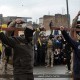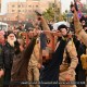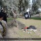 Two masked IS fighters, dressed in khaki military fatigues are photographed standing behind the two crucified men. Upon drawing their pistols, the fighters shoot the two alleged bandits in cold blood. Their motionless bodies remain tied to the metal crosses to the delight of the all male crowd.
