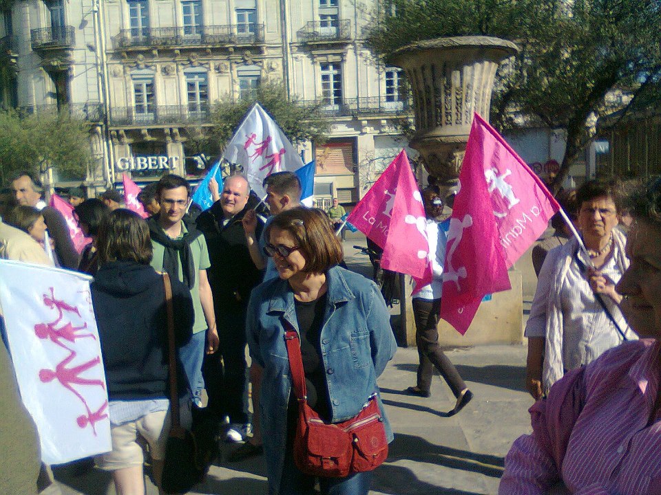 A cet instant, mon instinct altruiste prend le dessus et s’exprime, et me voilà parti, appareil photos en main, à la chasse aux images. Après avoir traversé le centre, je me retrouve nez à nez avec un rassemblement d’une bonne centaine de manifestants contre le projet de loi du Président (le fameux amendement 31), devant la Préfecture de la cité la moins homophobe de France… Je croise une caméra de télévision d’M6, seule chaîne présente sur les lieux (avec moi), pour couvrir l’évènement. Je me rends ensuite dans le quartier gay se trouvant juste derrière l’emplacement des opposants, pour me mêler alors aux personnes plus ou moins du « milieu homo », tranquillement installées en terrasse de la Place du marché aux fleurs. (!!) A mes questions, une membre d’association de référence en matière de lutte contre l’homophobie m’apprend qu’il s’agit de la deuxième manifestation pour tous qui a lieu à Montpellier, faisant suite à la précédente, qui s’était déroulée ainsi de 16h à 20h, une ou deux semaines auparavant.
