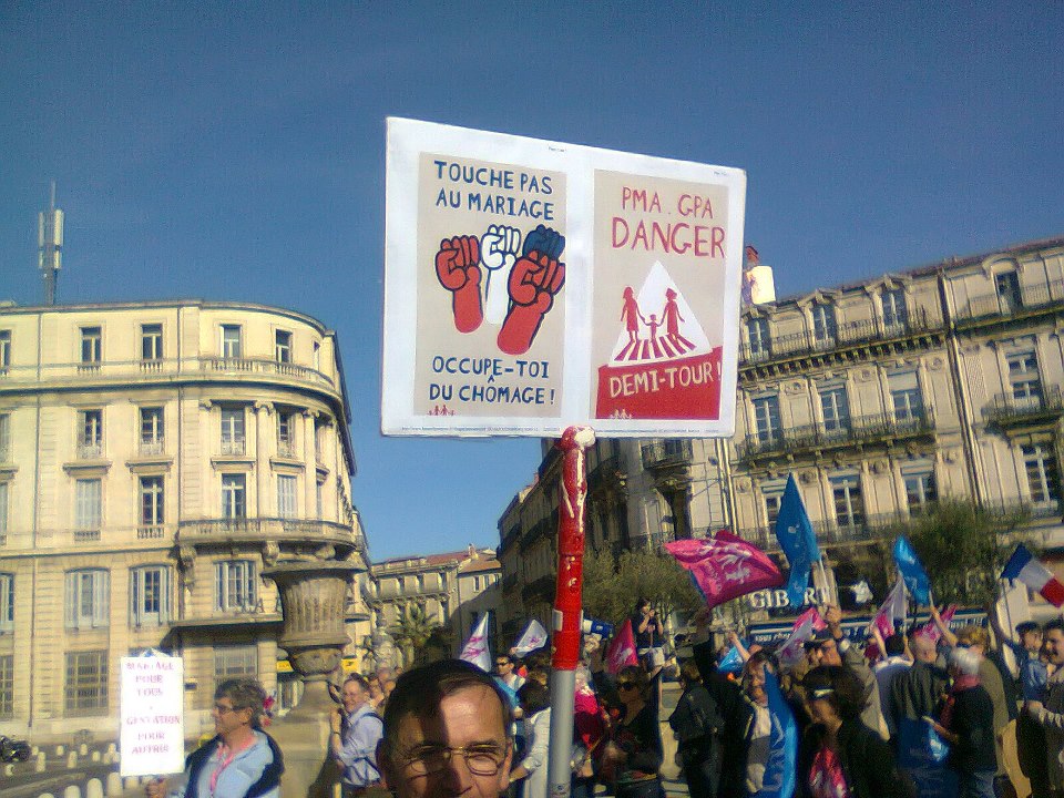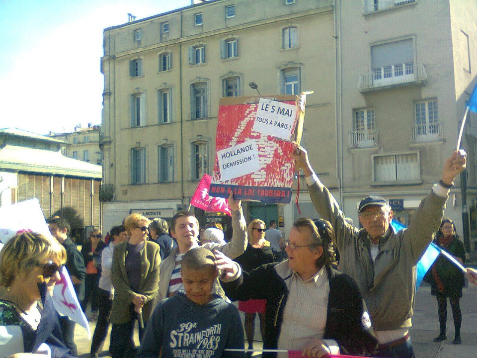 Le lendemain même, cette forme de « psychose de masse » se confirme au pied de ma résidence… « HOLLANDE, TA LOI ON N’EN VEUT PAS » est le slogan scandé que j’entends subitement vers 16h par une procession de manifestants véhiculés, toutes sirènes et klaxons urlant, en train de passer sous mes fenêtres! Les protestations anti mariage pour tous semblent atteindre et se confirmer dans la ville de Montpellier!