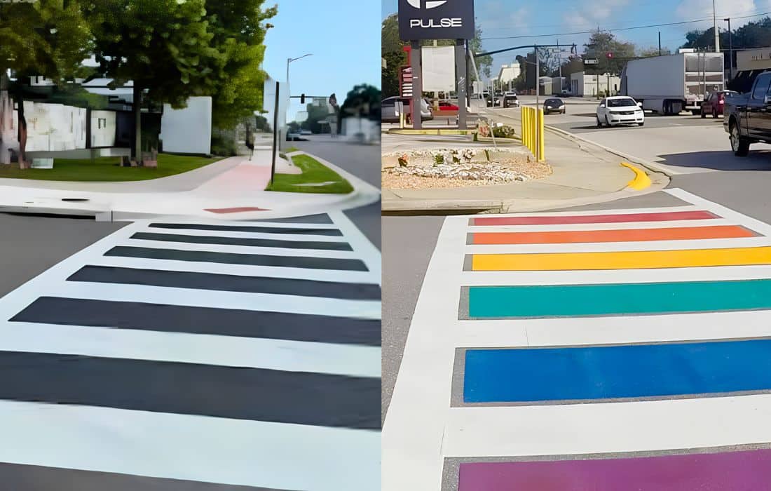 Dans la nuit du 21 août 2025, les autorités de l’État de Floride ont fait repeindre un passage piéton aux couleurs de l’arc-en-ciel installé sur Orange Avenue, en hommage aux 49 victimes de la fusillade du Pulse Nightclub en juin 2016, l’un des pires attentats de l’histoire récente des États-Unis.