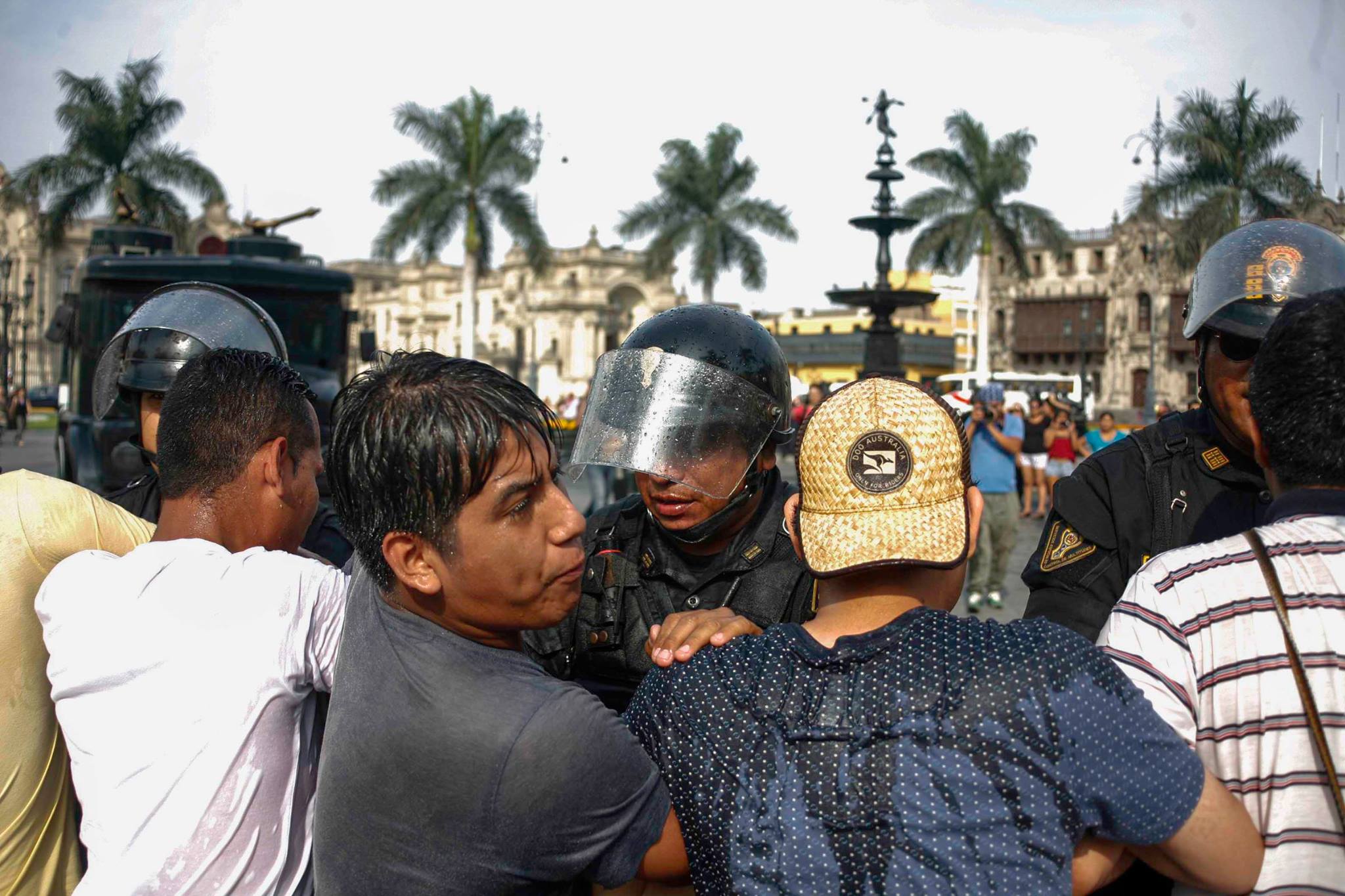 Ils étaient quelques dizaines de manifestants réunis ce 13 février pour un kiss-in « contre l’homophobie » organisé sur l’esplanade de la Plaza de Armas, en plein cœur de la capitale péruvienne. Un événement symbolique et pacifique qui va rapidement tourné à la répression, avec en arrière-plan des camions anti-émeutes de la police pulvérisant les militants à coups de jets d’eau et de kérosène.