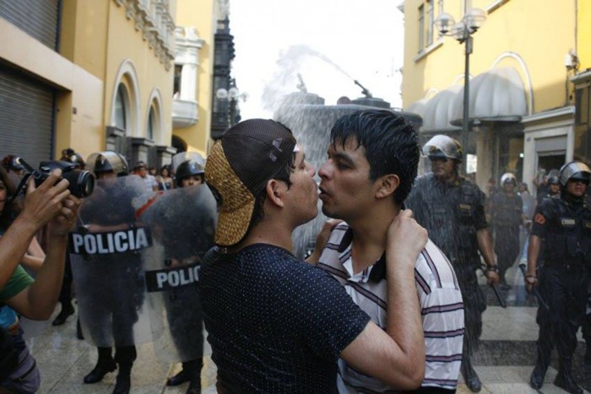 Sin Eqiguetas, a LGBTI website in Lima, posted pictures that showed same-sex couples kissing as armored police trucks loomed in the background.
