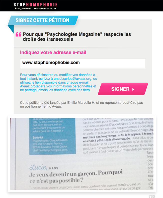 Ce magazine à grand tirage doit reconnaitre l’expérience intime et personnelle de son genre profondément vécue par chacun, qu’elle corresponde ou non au sexe assigné à la naissance, contrairement à ce qu’avance Claude Halmos.
