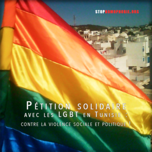 Nous, Tunisiennes et Tunisiens, au nom des valeurs révolutionnaires et de la nouvelle Constitution, nous dénonçons la campagne haineuse et les appels au meurtre contre les militants et militantes engagés pour la défense des droits des personnes homosexuelles : Pétition