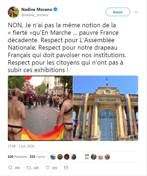 Nadine Morano s’est d’ailleurs illustrée, cette année encore, dénonçant la « décadence » de la « pauvre France », avec une image rendue célèbre par son utilisation de la part de l’hebdomadaire d’extrême droite Minute, condamné pour injure homophobe en 2014.