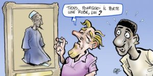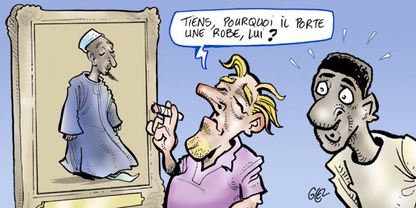 La polémique s’était en effet encore amplifiée avec la publication le 28 janvier d’une illustration satirique sur « Jeune Afrique », signée du dessinateur de presse Damien Glez, représentant Cheikh Ahmadou Bamba, le fondateur de la confrérie musulmane mouride du Sénégal. Affrété d’un caftan, un habit traditionnel, le religieux est face à un observateur occidental qui s’interroge en le regardant : « Tiens, pourquoi il porte une robe lui ? ».