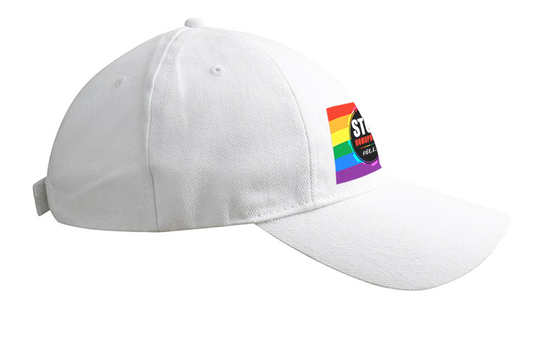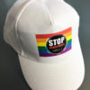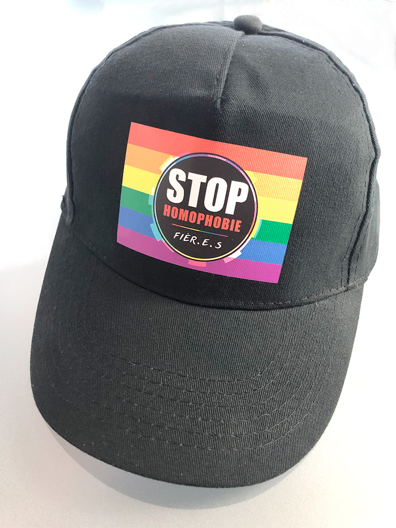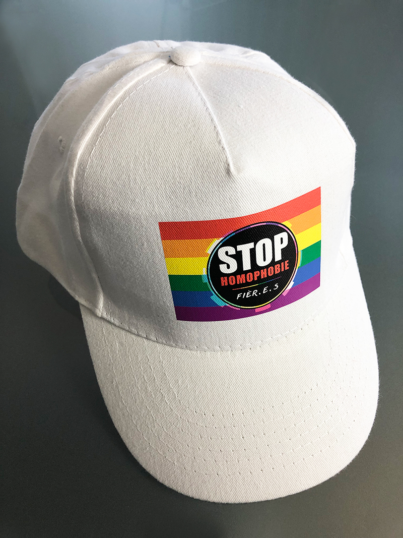 Casquette réglable, type baseball, 100% coton, imprimée du logo STOP « Team Pride 2019 », 2 couleurs (noir ou blanc).
