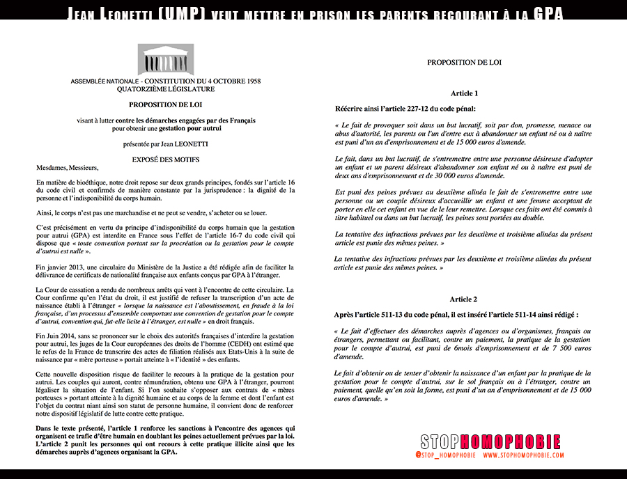 Dans le texte présenté, l’article 1 renforce les sanctions à l’encontre des agences qui organisent ce trafic d’être humain en doublant les peines actuellement prévues par la loi. L’article 2 punit les personnes qui ont eu recours à cette pratique illicite ainsi que les démarches auprès d’agences organisant la GPA.