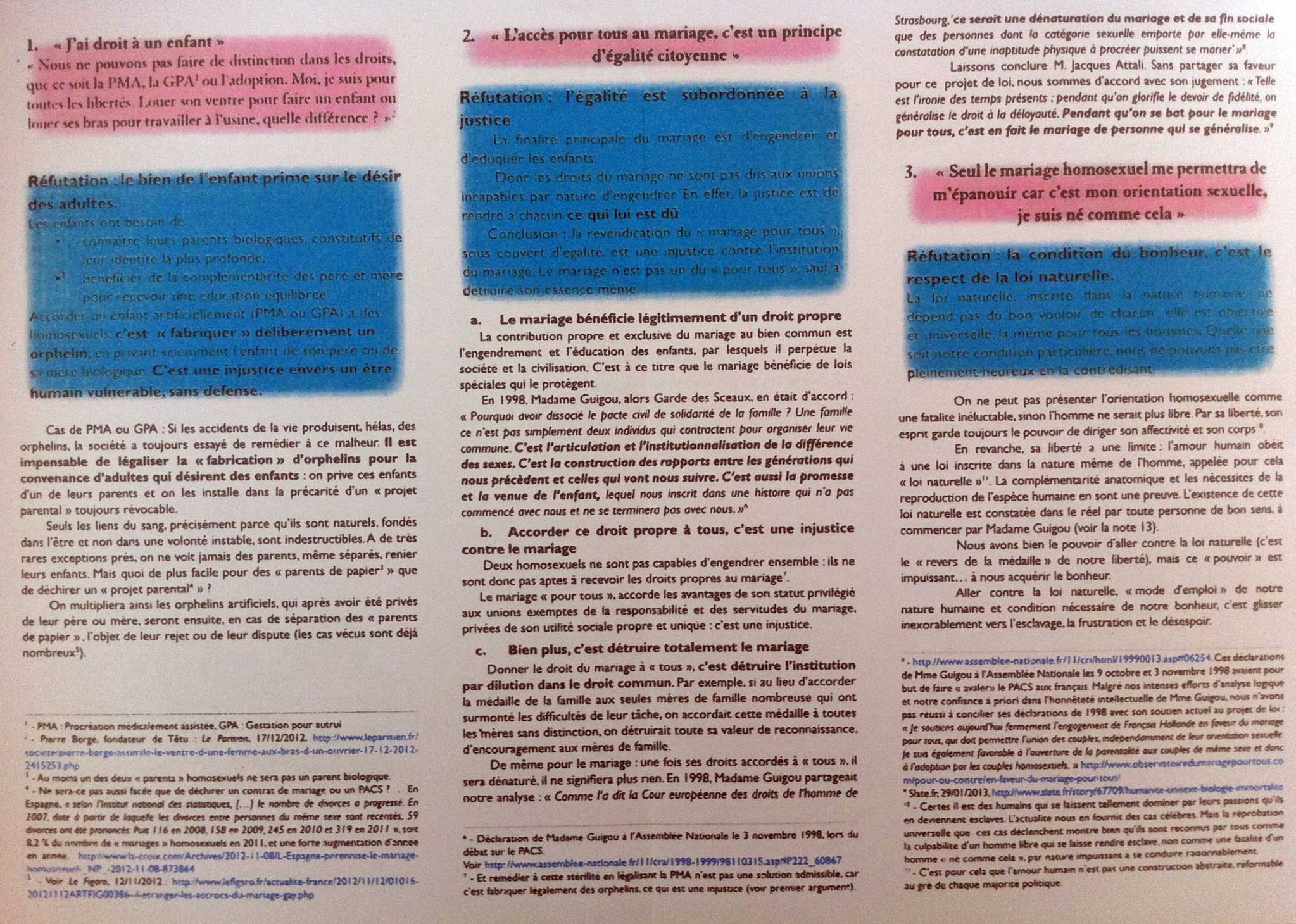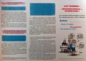 Les « cinq grandes raisons invoquées en faveur du ‘mariage pour tous’ et leur réfutation ». Un tract A3 recto-verso présenté comme émanant de l’association des juristes catholiques du Languedoc Méditerranéen, intitulé « Loi Taubira :’Révolution sociétale‘ ou suicide social ? ».