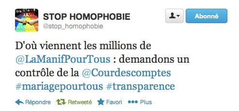 Accueil Assos. LGBT Qui finance la manif pour tous ? Assos. LGBT Politiques Stop HomophobieThe estimated reading time is less than a minute Qui finance la manif pour tous ? Revue du Web 12/04/2013 162000€ une pub dans Le Figaro 138000€ dans Le Monde @LaManifPourTous, @Frigidebarjot , 300.000 € ! Qui vous finance ? Post navigation Previous article Le Refuge : La lutte contre l’homophobie commence aujourd’hui. Next article Quand la sénatrice jouait pendant le débat sur le mariage gay !