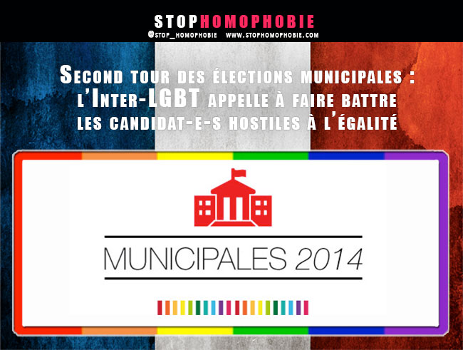 En conséquence, l’Inter-LGBT appelle à se mobiliser en faveur des candidat-e-s portant les valeurs républicaines pour faire battre, partout en France, les signataires de la charte de la Manif pour tous et les candidat-e-s d’extrême droite au second tour des élections municipales.