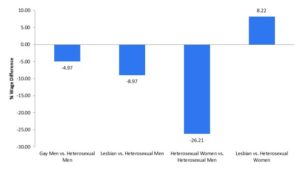 Selon l’étude, qui porte uniquement sur les personnes en couple, les homosexuels de sexe masculin gagneraient 5% de moins que les hétérosexuels. Les lesbiennes, elles, ne sembleraient pas souffrir de discriminations, puisque leur rémunération serait supérieure de 8% à celle des hétérosexuelles. Un écart qui reste tout de même bien inférieur à celui entre hommes hétérosexuels et femmes hétérosexuelles (26% de moins).