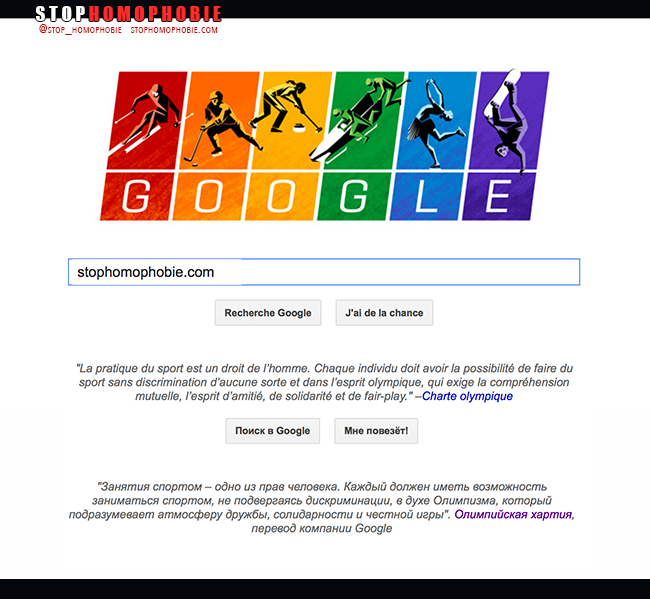 La page d’accueil de Google depuis minuit (jour de lancement des JO de Sotchi) : Pictogrammes symbolisant différentes épreuves des JO, faisant directement le lien entre les les JO et les LGBT, suivit d’un extrait de la Charte Olympique dans lequel il est dit que la discrimination n’est pas une valeur sportive.