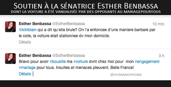 Soutien à la sénatrice Esther BENBASSA dont la voiture a été vandalisée par des opposants au #mariagepourtous !