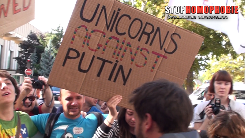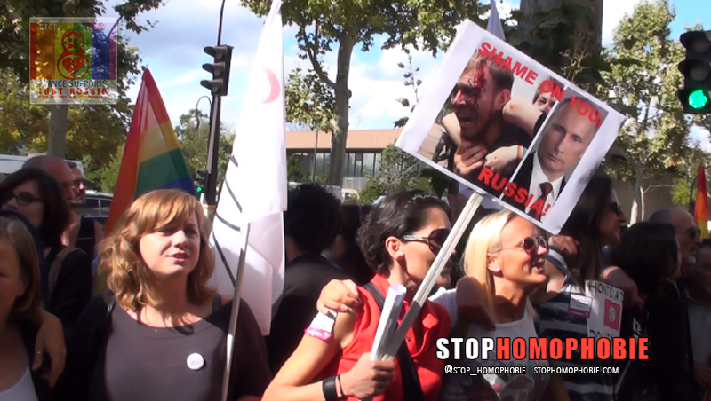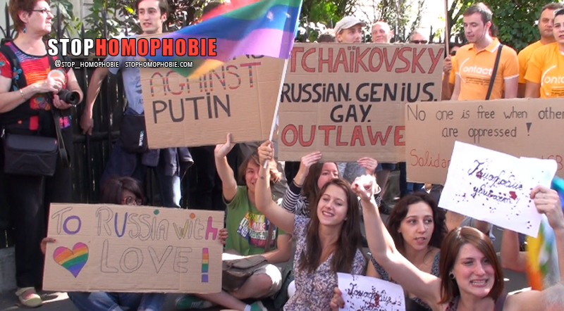 Des dizaines de couples de même sexe se sont embrassés dimanche devant l’ambassade de Russie à Paris pour dénoncer une loi russe « homophobe » et « régressive », promulguée fin juin par Vladimir Poutine.