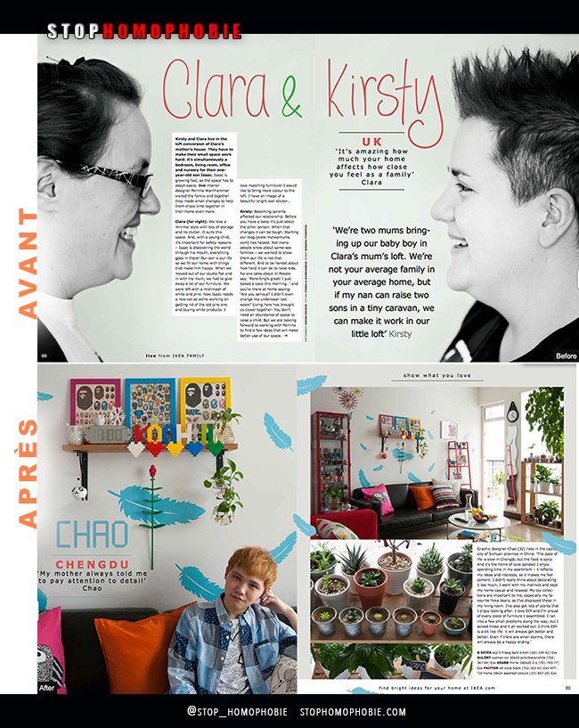 >> The December issue of the magazine, which will be distributed in most countries in which Ikea operates, contains a long feature about the lives of Clara and Kirsty, a Dorset-based lesbian couple and their Ikea-filled interiors. « We’re two mums bringing up our baby boy in Clara’s loft, » says Kirsty in the story. « We’re not your average family in your average home, but if my nan can raise two sons in a tiny caravan, we can make it work in our little loft. »