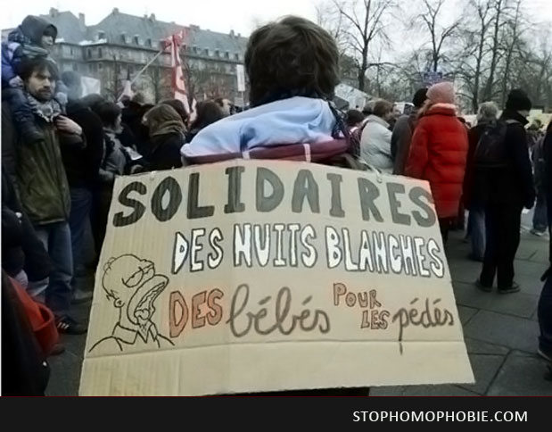 En tête de cortège, une banderole avec « Non à l’homophobie, oui à l’égalité des droits », derrière laquelle se tenaient de nombreux élus de la Ville et de la Communauté urbaine de Strasbourg (plusieurs arboraient leur écharpe tricolore), mais aussi le député PS Philippe Bies ou la député européenne (PS) Catherine Trautmann. Dans la foule, des « hétéros » venus soutenir le mouvement, pour leur fils ou leur fille, et des catholiques, protestants ou juifs refusant le discours actuel des autorités religieuses.