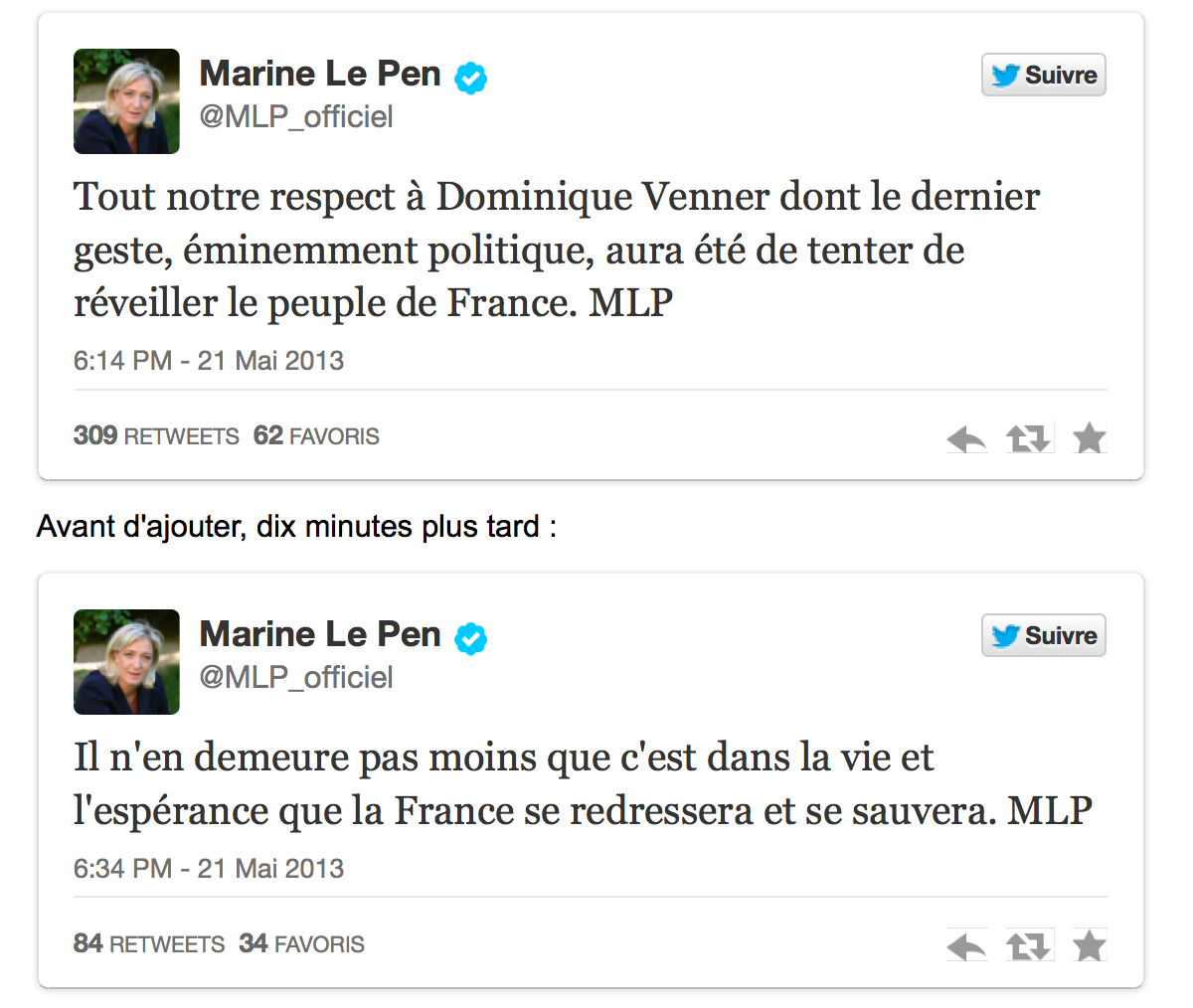 Sur Twitter, Marine Le Pen a exprimé son « respect » à Dominique Venner en voyant dans son geste « éminemment politique » une tentative de « réveiller le peuple de France », avant d’ajouter, dix minutes plus tard : « une connotation politique », même si « c’est un geste regrettable ». « J’ai lu son dernier texte, il est assez poignant », a ajouté la députée européenne.