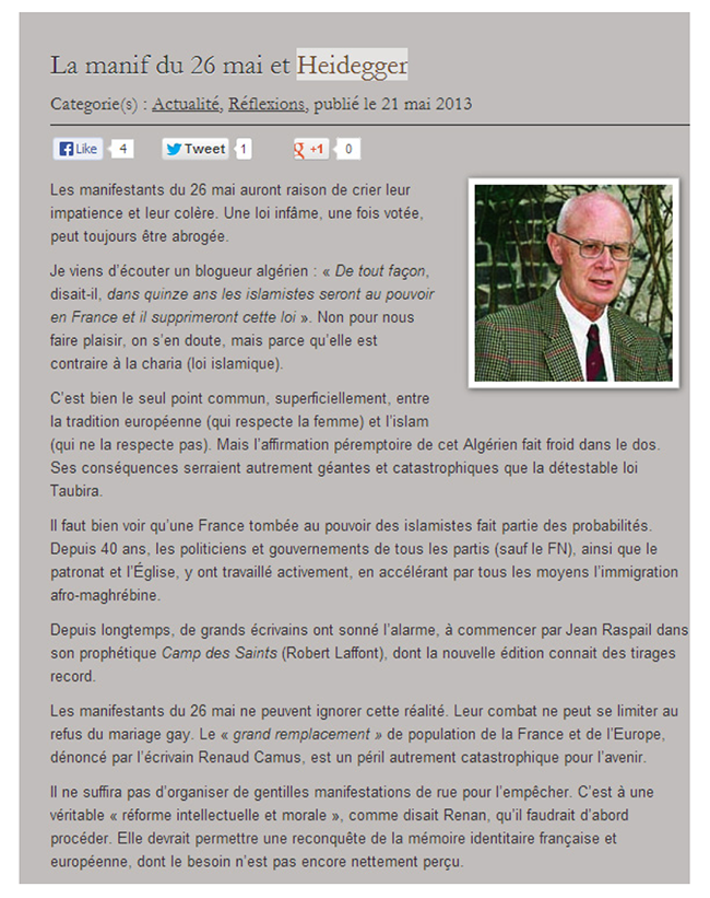 L’homme venait en outre de publier une note sur son blog personnel intitulée « La manif du 26 mai et Heidegger », dans laquelle il dénonçait une « loi infâme » et appelait les anti-mariage homo à élargir leur combat à la lutte contre « le grand remplacement de la population de la France et de l’Europe » par les islamistes. « Il faudra certainement des gestes nouveaux, spectaculaires et symboliques pour ébranler les somnolences, secouer les consciences anesthésiées et réveiller la mémoire de nos origines », écrivait-il.