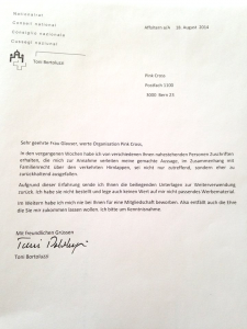Contacté par «20 Minuten», Tony Bortoluzzi confirme qu’il est bel est bien l’auteur de la lettre, écrite sur un papier du Conseil national. Il n’a pas pour autant souhaité donner davantage de précisions.