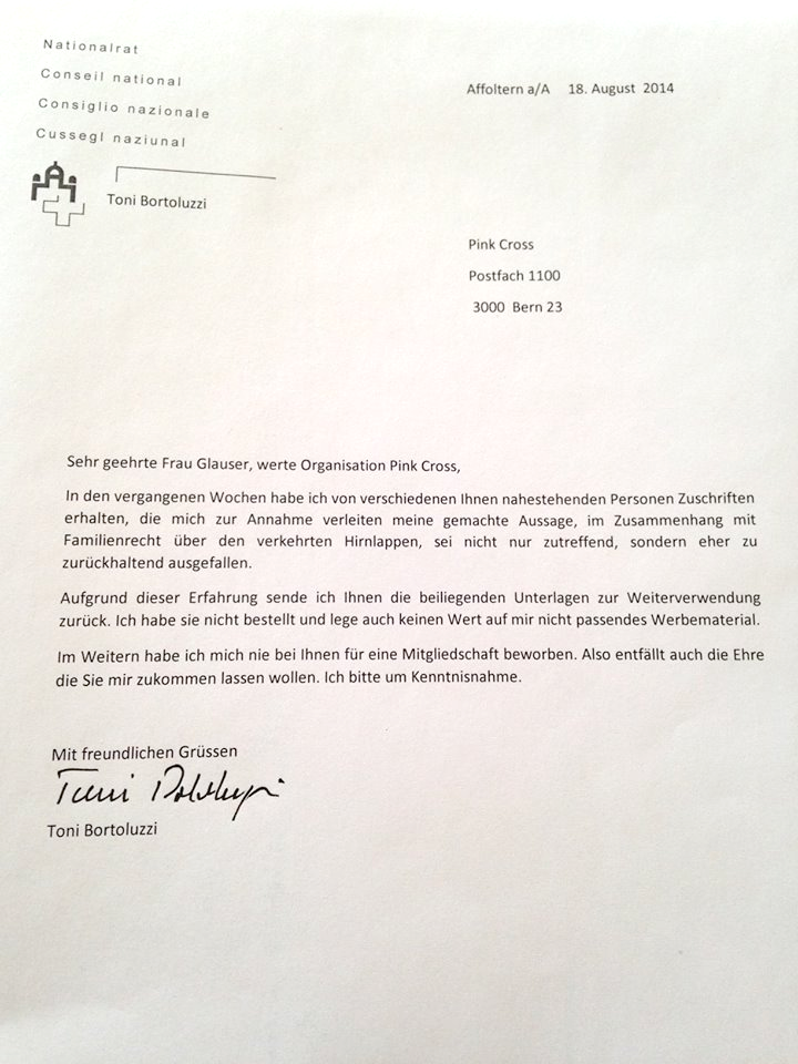 Au début de l’été, Toni Bortoluzzi avait parlé du «cerveau à l’envers» et de la «déviance» des homosexuels. Opposé à la réforme du droit de la famille, le politicien est allé dans l’extrême avec ses propos homophobes dans le « Beobachter » https://www.stophomophobie.com//berne-les-derapages-homophobes-dun-elu-udc/