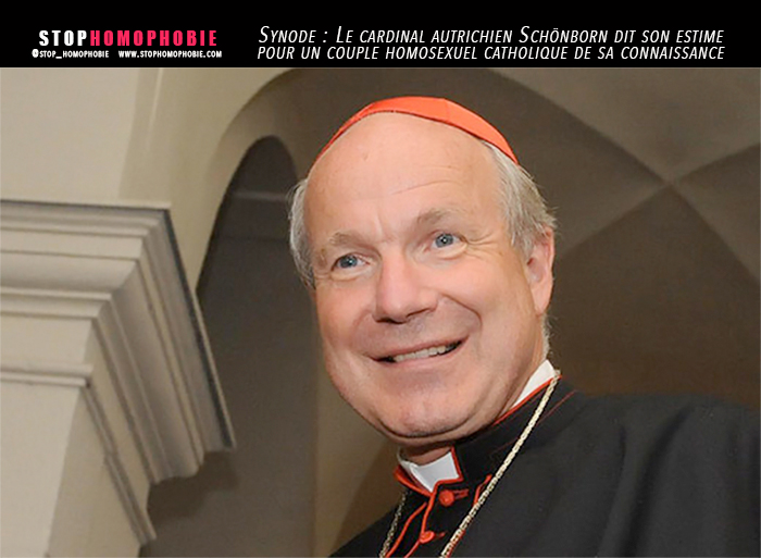 Interrogé sur son amitié envers deux homosexuels catholiques vivant en couple et très engagés dans l’Eglise, le cardinal autrichien Christoph Schönborn, proche du précédent pape Benoît XVI, a confié : Ce sont des « personnes humaines merveilleuses » qui se sont soutenues quand l’un a été malade. Le mot de la fin (pour l’Eglise) est l’accueil. Le principe de base est que nous regardions d’abord la personne et pas la tendance sexuelle. Chaque personne a une dignité qui va au-delà de cette tendance, et la tendance sexuelle en elle-même n’a rien à voir avec le péché », a affirmé ce théologien qui avait participé à la rédaction du Catéchisme de l’Eglise catholique.