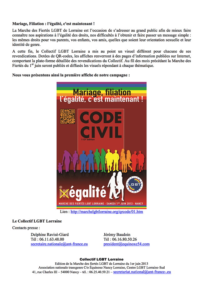 Marche des Fiertés LGBT de Lorraine le 1er juin à Nancy : Mariage, filiation, PMA, état civil, don du sang : l’égalité c’est maintenant ! Le...