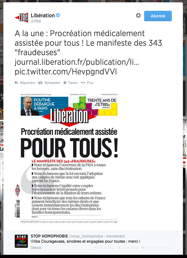 Dans ce texte, publié par le journal « Libération », les signataires revendiquent « avoir eu une insémination avec donneur afin de fonder une famille« , un procédé seulement autorisé...