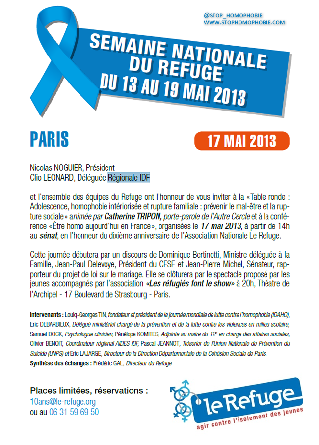 Nicolas Noguier, Président, Clio Léonard, Déléguée régionale IDF, et l’ensemble des équipes du Refuge ont l’honneur de vous inviter à la « Table Ronde » : « Adolescence, homophobie...