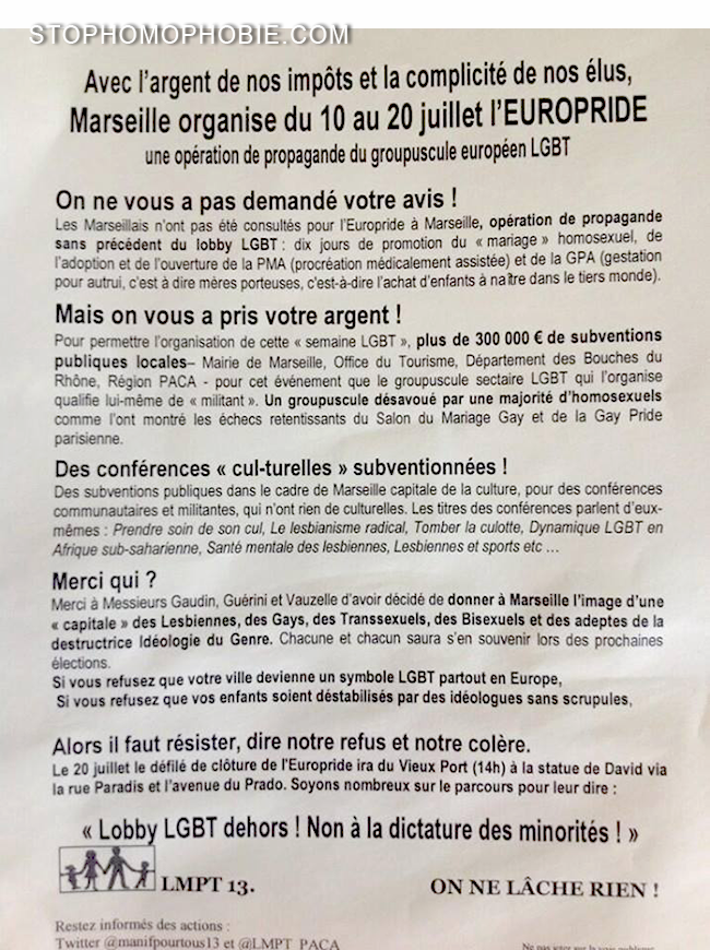 Et voilà, c’est reparti : « Avec l’argent de NOS impôts et la complicité de NOS élus… Marseille organise l’Europride » ;( Quand la clique des antis retape...