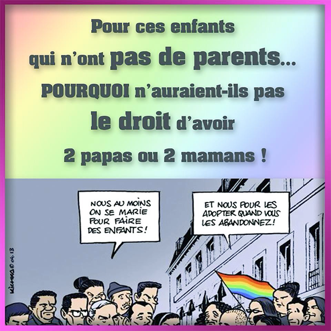 Assos. LGBT Politiques Société Stop Homophobie Pourquoi ces enfants qui n’ont pas de parent, n’aurait-il pas le droit d’avoir deux papas ou deux maman ? Revue du Web 26/05/2013 Deux papas ou deux mamans c’est élémentaire et tout aussi bien !