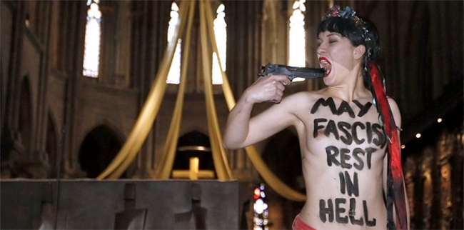 Video : Au lendemain du suicide de Dominique Venner, une activiste de Femen mine la scène, seins nus, au même endroit.