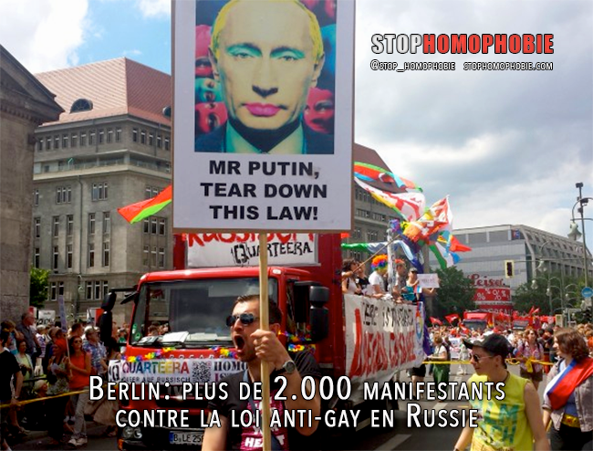 Plus de 2.000 personnes ont manifesté samedi à Berlin pour protester contre une loi russe jugée discriminatoire contre les homosexuels. Derrière des pancartes comme «Stop au...