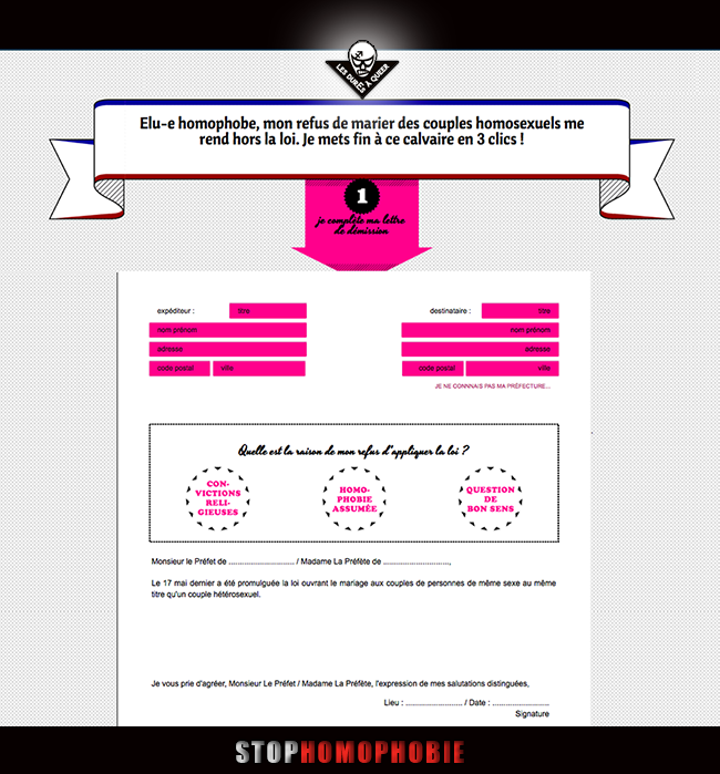 Elu-e homophobe, mon refus de marier des couples homosexuels me rend hors la loi. Je mets fin à ce calvaire en 3 clics ! Demission-pour-tous.com :...