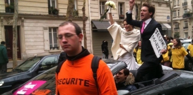 La Manif pour tous : tshirts orange, rose, bleu, caniche et clowns