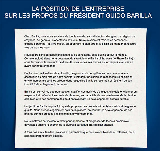 Barilla France s’excuse à son tour devant les répercussions très négatives en terme d’image des propos de Guido Barilla sur les homosexuels. « Barilla reconnait la diversité...