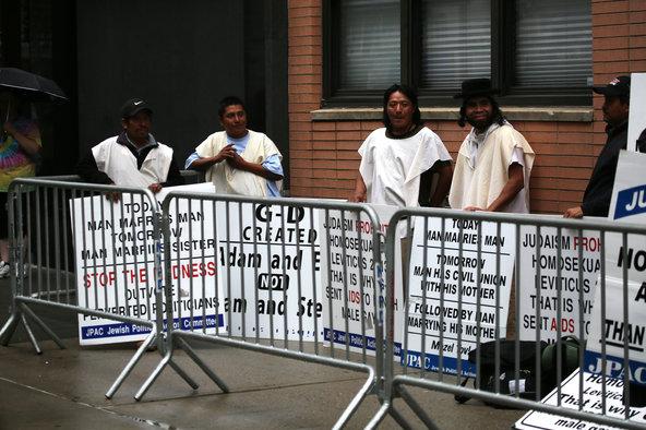 Des journalistes, intrigués par l'allure de personnes portant des pancartes clamant que "le judaïsme interdit l'homosexualité", ont dénoncé l'initiative.