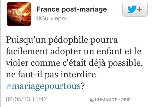 Assos. LGBT Politiques Stop Homophobie Homophobie ordinaire sur tweeter ! Revue du Web 02/05/2013 Quand les plus incultes continuent de faire des amalgames entre homosexualité et pédophilie !!