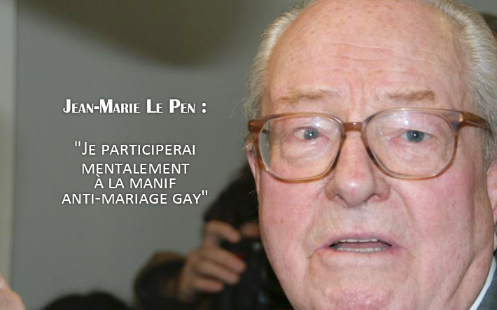 Le président d’honneur du Front national, Jean-Marie Le Pen, a déclaré dimanche à Hem (Nord), qu’il participerait « mentalement » à la manifestation contre le mariage homosexuel du...