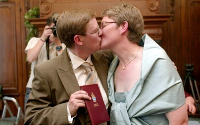 Tour du monde des premiers mariages homosexuels. Escale en Belgique avec Marion et Christel, dont l’union a été célébrée en 2003. Les mariées : Marion Huibrechts...