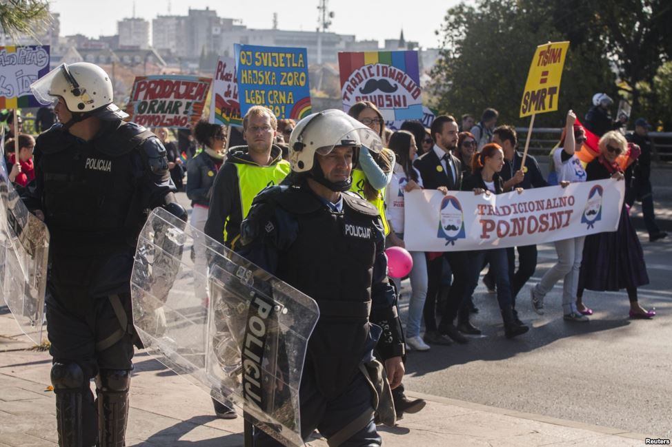 Environ 2000 policiers, selon des sources officielles, ont été déployés pour assurer la sécurité des participants à cette seconde Gay Pride à Podgorica, capitale du Monténégro.