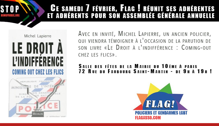 Flag ! a décidé d'accueillir Michel Lapierre, un ancien policier, qui viendra témoigner à l'occasion de la parution de son livre "Le Droit à l'indifférence. Coming-out...