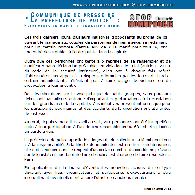 Communiqué de presse de « La préfecture de police » : Evénements en marge de #lamanifpourtous !