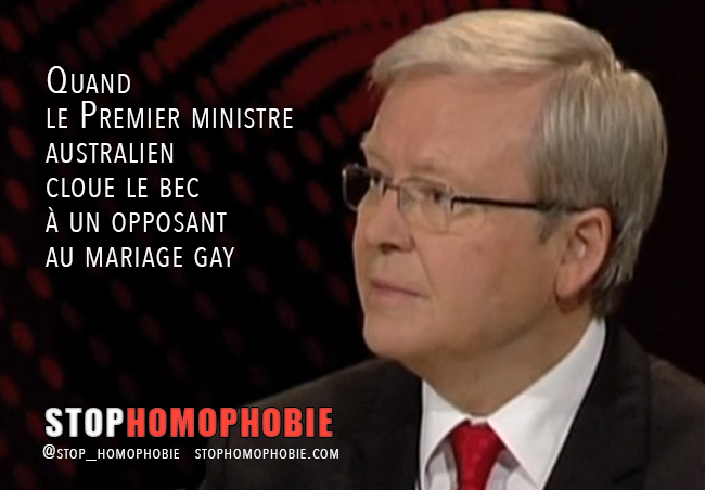 À quelques jours des élections, le Premier ministre australien sortant Kevin Rudd a vigoureusement défendu le mariage homosexuel au cours d’un question-réponse télévisé. [dailymotion] http://www.dailymotion.com/video/x144lqo_le-premier-minsitre-australien-cloue-le-bec-a-un-opposant-au-mariage-gay_news[/dailymotion]