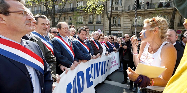 Un message diffusé sur le compte Twitter de La Manif pour tous (LMPT), les opposants au mariage pour les couples de même sexe : « Parisiennes, Parisiens,...