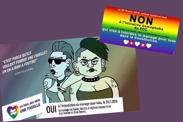 antimariage pour tous, Arc-en-Ciel, Artiste Mal Pensant, Barbara Lanthemann, Béatrice Wertli, discrimination fiscale, Parti démocrate-chrétien, PDC, Pro Aequitate, Suisse, visuels homophobes