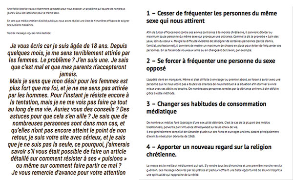 Société Stop Homophobie Témoignage Homosexualité : Une liste de «trucs et astuces» pour «résister à ses pulsions» Revue du Web 20/04/2015 Le classement des «quatre meilleures manières pour lutter efficacement contre les pulsions malsaines de l'homosexualité».