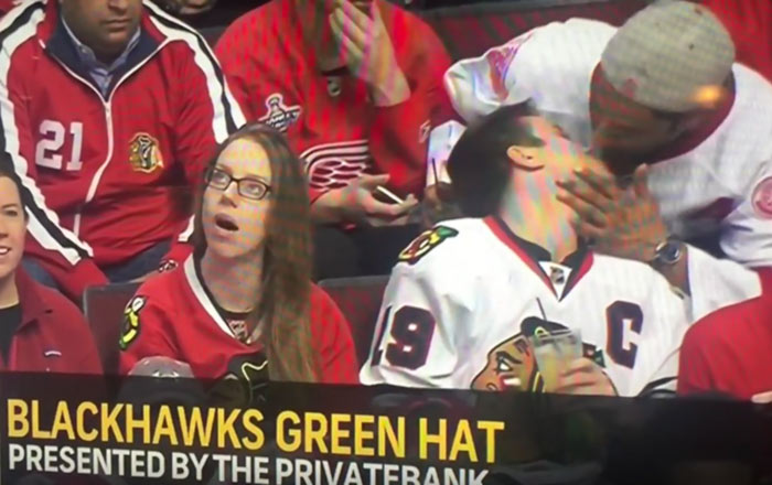 Encourager par la foule, un fan de l'équipe à domicile va répondre à la sollicitation des lèvres du spectateur derrière lui, et réconcilier les équipes.